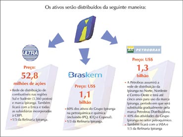 A Petrobras aportou US$ 1,1 bilhão para ficar com 40% da área petroquímica, 833 postos da Ipiranga nas regiões Norte, Nordeste e Centro-Oeste podendo usar a bandeira por até cinco anos e a Ipiranga Asfaltos. A Braskem irá captar no mercado US$ 1,3 bilhão para ficar com 60% da petroquímica. Ninguém ficou com a Refinaria Ipiranga integralmente e a unidade será dividida e administrada em partes iguais entre as três empresas.