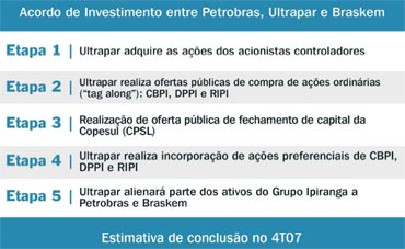 Na terceira etapa, Braskem e Petrobras farão proposta aos acionistas para fechamento do capital da Copesul. Na quarta etapa, o Grupo Ultra fará uma incorporação de ações preferenciais em poder dos minoritários da Companhia Brasileira de Petróleo Ipiranga, da Distribuidora de Produtos de Petróleo Ipiranga e da Refinaria de Petróleo Ipiranga, que receberão ações preferenciais da Ultrapar.